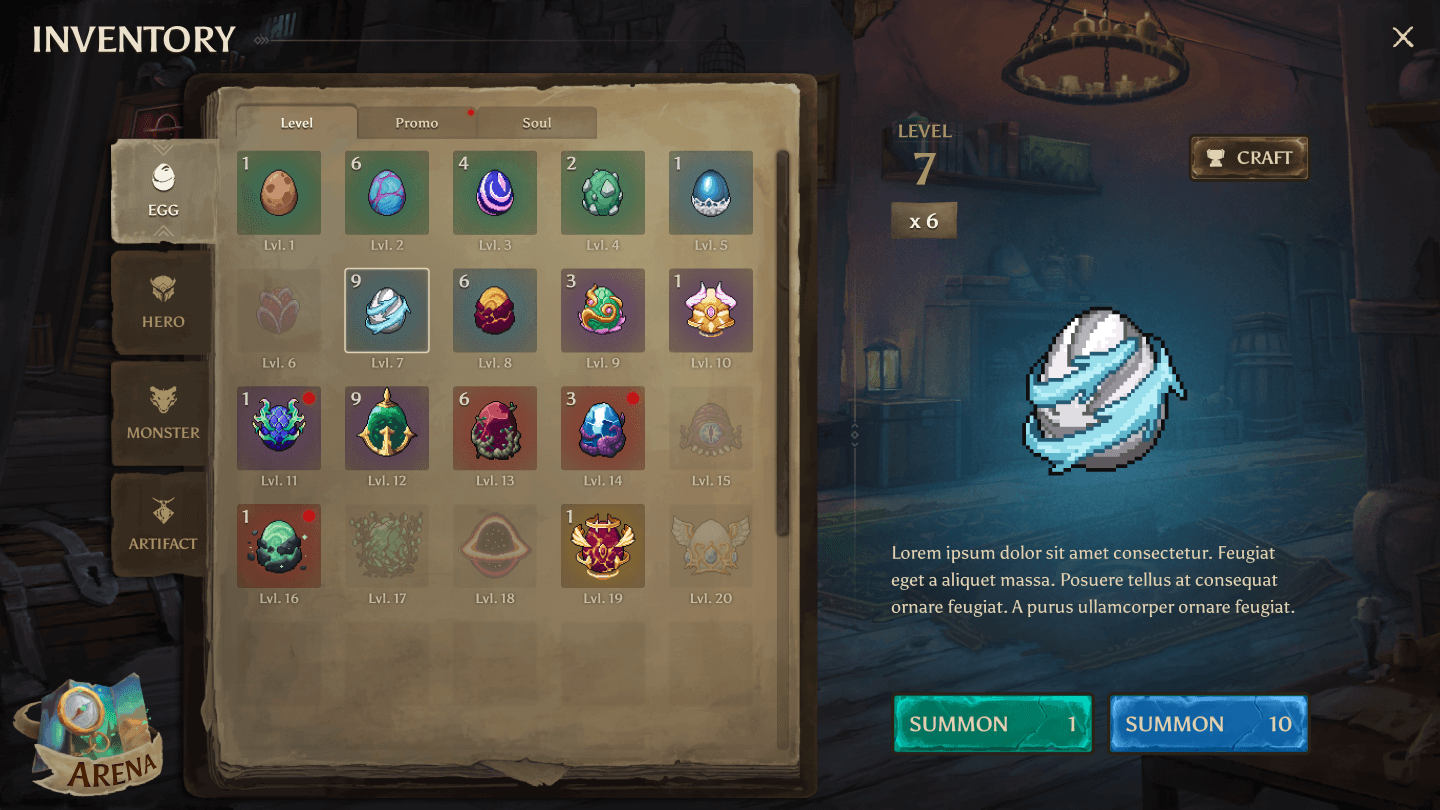 As a fantasy game centered around summoning monsters, the core concept revolves around summoning books. The UI design base on the diegetic UI adopts a skeuomorphic style to enhance the fantasy stylize aesthetic, making the experience feel more immersive and magical.